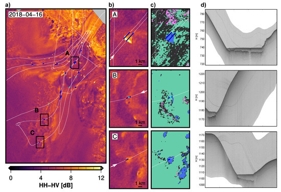 (a) Comparison between SGLs from PBC and airborne snow radar picks. Dark blue dots denote an agreement in classification between both techniques; UWBM-picks without a corresponding classification by PBC on 16 April 2018 are shown in cyan. Three detailed examples on the right show HH–HV (b), the classification result ((c), colors as in Figure 3) and the corresponding radar profiles (d). The white arrows in (b) denote the flight direction, i.e., the orientation of the radar profiles from left to right.