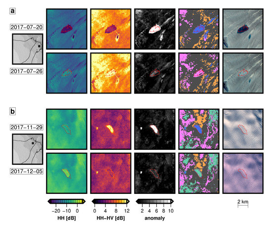 To justify that a disappearance of classified water is really related to a lake drainage, we calculate similar time series for the average HH and HH–HV backscatter within the lake outline (as in [44,45], but we use both polarizations). As it can be seen in Figure 7a, an open water lake surface (as observed during the summer) causes a specular reflection, which means that the side-looking radar system hardly receives any return power at all. After a lake drainage, the signal is reflected from the former lake bottom, which is significantly rougher, resulting in an increase in HH. Hence, a drainage of an open water lake is accompanied by an increase in HH. During the winter time (Figure 7b), the HH-channel is less suitable to detect drainages because the signal has to penetrate a layer of ice and snow first to reach the buried lake. Hence, the HH-channel is already strongly influenced by the interactions of the radar signal with the top layers and the presence or absence of a flat water table is less prominent in HH. In contrast, the HV-channel is significantly more affected by a winter time drainage. After the strong dielectric contrast of the water body is gone, the signal can penetrate even deeper below the former lake bottom, increasing the HV-reflection significantly more, compared to HH. Hence, the relatively high HH–HV difference of a buried lake decreases rapidly and both channels become almost balanced after a lake drainage. Both kinds of rapid changes in backscatter (HH increase and HH–HV decrease), however, can also have other sources, e.g., larger scale weather effects. To justify that these changes affect the lake only, but not its surroundings, we also check the absolute anomaly (see Equation (1)) for such significant jumps.