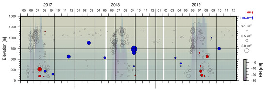 Based on these lake outline definitions, we can analyze the water area of each lake over time, and hence, detect rapid drainage events. Therefore, we create lake area time series by summing up the classified water pixels of each epoch. In order to reduce the noise, we smooth these series using a floating median over three epochs (covering a time interval of 12 days). Now, we scan these time series for rapid lake drainages, which we define as a rapid change in lake area water fraction (compared to the total area within the outline) from more than 30% to less than 10%. Previous studies with optical data used significantly higher thresholds for filled lakes (e.g., 80 % in [15]). However, several lakes vary in area significantly between different years, so that in cold years they do not reach levels as 80% of the maximum lake area at all. As we also observed drainages of such partly filled lakes we chose a lower threshold to detect drainage events. All such rapid declines of water area are displayed as circles in Figure 8. The vast majority of such events are located at the very beginning of the melt season. To illustrate this temporal coincidence, we plotted the average backscatter HH over the drainage basin area in the background of Figure 8 (as shown before in Figure 3d). After the onset of melt or even rain events, the wet ice sheet surface looks very similar to the lakes themselves in the radar images, and as a consequence, the water within the lakes can no longer be detected reliably from PolSAR, causing these apparent drainages. Visual inspection of simultaneous optical imagery prove that these lakes are not draining. Therefore, another criterion is necessary to distinguish between real and false drainages.