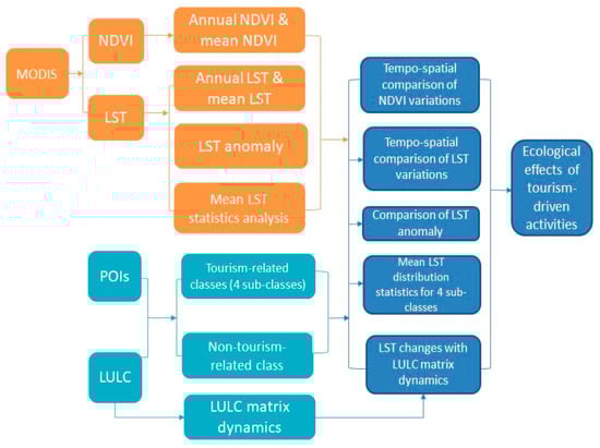This study aimed to assess the long-term spatio-temporal influence of specific human activities on the ecological variables. Specifically, the study focused on the influence of the tourism-related human activities on the variation of LST, NDVI and land-use changes. We adopted a combination of satellite-derived products from the cloud-based Google Earth Engine, land cover data and place-based POIs to analyse the spatio-temporal variations of ecological variables in tourism-related sites and non-tourism-related sites. In order to highlight the influence of tourism-related activities, we mainly used the POIs with geographic information to categorise random sites into tourism-related and non-tourism-related sites and four function-defined tourism-related sites, in order to compare the influence on the variation of LST and NDVI changes of different tourism-related activities.