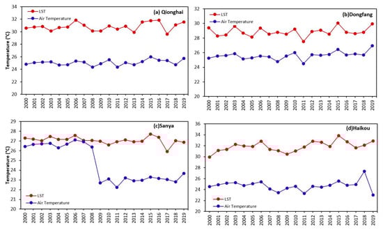 For each of the four stations, in situ air temperature was generally lower compared to the MODIS derived LST values. The comparison of in situ air temperature and MODIS derived LST revealed Pearson correlation coefficients of 0.73 (Dongfang station), 0.2 (Haikou station), 0.56 (Qionghai station) and 0.40 (Sanya station), implying a marginal to high positive correlation between satellite-derived LST and observed in situ temperature. Root mean square error (RMSE) values for the variation of LST and in situ temperature in the four stations were 3.28 °C, 7.25 °C, 5.73 °C and 2.97 °C in Dongfang, Haikou, Qionghai and Sanya stations, respectively.