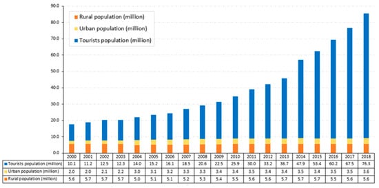 From the annual Statistics Yearbooks (listed in Table 1) published by the Chinese National Bureau of Statistics (2000 to 2018), we collated and tabulated the annual population data of the Hainan region (Figure 4). The population of Hainan Island includes the rural, urban and tourist population. The rural population remained stable for the duration of the study, while the urban population increased from about 2 million people in 2000 to 3.6 million in 2018. According to the yearbook, the changes in the urban population could partially be attributed to the “migratory-bird migration” population, whereby the owners only reside in their private apartments during the winter season. There was a relatively drastic increase in the tourist population, with a growth from about 10.1 million in 2000 to 76.3 million in 2018. The tourist population in 2018 was more than eight times that of the local population. Inevitably, the rise of tourist population and development of tourism-related infrastructure in the region would be expected to contribute to environmental changes, including vegetation changes, variation in the land surface temperature and other variables of the local ecosystem.