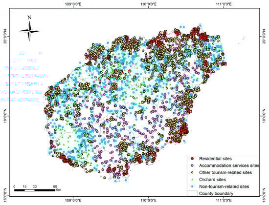 Specifically, ‘orchard sites’ are the land-use patches that were converted from cultivated land and forest land in 2000 into orchards in 2018 to meet the tourists’ demand for tropical fruits, according to the previous study in Hainan [20]. The ‘Residential sites along shorelines’ sub-class contains the construction sites of real estate to facilitate the housing of the “migratory-bird tourists” or “migratory-bird population”, who purchased apartments in Hainan and regularly spent the winter months in Hainan but left again in summer each year; this category of tourist is classified as new immigration. Based on the previous study in which residential sites were identified [20], we extracted the ‘residential sites along shorelines’ from the residential POIs within the 10 km buffer along the shoreline and the construction lands which were previously farmlands in the plains along the shoreline. The ‘accommodation service sites’ sub-class includes hotels and other accommodation facilities for hosting short-term tourists. The ‘Accommodation service sites’ sub-class sites were filtered from the POIs information using keywords related to accommodation. The ‘Other tourism-related sites’ sub-class contains the sites that facilitate tourists’ dining, shopping, entertainment and transportation needs. These sub-class sites were chosen from the POIs that contained ‘cultural service places’, ‘museums’, ‘theatres’, ‘shopping centres’, ‘city parks’, ‘transportation’ and other related keywords. ‘Orchard’ sites were extracted from the random points on the land use patches in 2000 and 2018 based on the land use/cover data. The ‘Orchard’ sites sub-class represents the sites where land was transformed from cultivated land and forest in 2000 into orchard in 2018, in order to meet the tourists’ demand for tropical fruits, according to the previous study [20]. There were 2319 tourism-driven sites (including 1879 ‘other tourism-related sites’, 179 ‘residential sites along shorelines’ and 152 ‘accommodation service sites’ 109 ‘orchard sites’) and 1493 non-tourism-driven sites (Table 2).