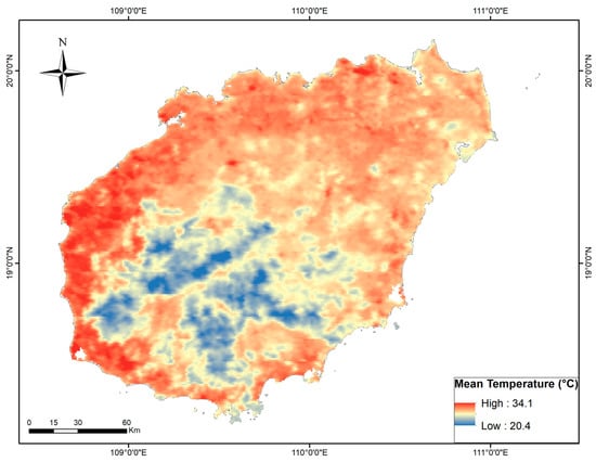 We calculated the mean annual temperature from 2000 to 2019 and the long-term mean temperature image for the 20 years from all 913 images. The long-term mean LST was mapped to identify the LST spatial distribution on Hainan Island. The LST variations for the two classes and the four sub-classes of sites were plotted to show the correlation of the LST with tourism-related activities in the 20 years. Specifically, the mean annual LST for the sites of both classes were plotted for each year using line charts to show the LST difference in each year and the LST variations within the two groups for the whole period. The mean temperature distribution of the four sub-class sites in the 20-year period was plotted to compare the relative LST differences within the four function-defined tourism-related sites, which highlights the influence of various types of tourism-related human activities on the LST.