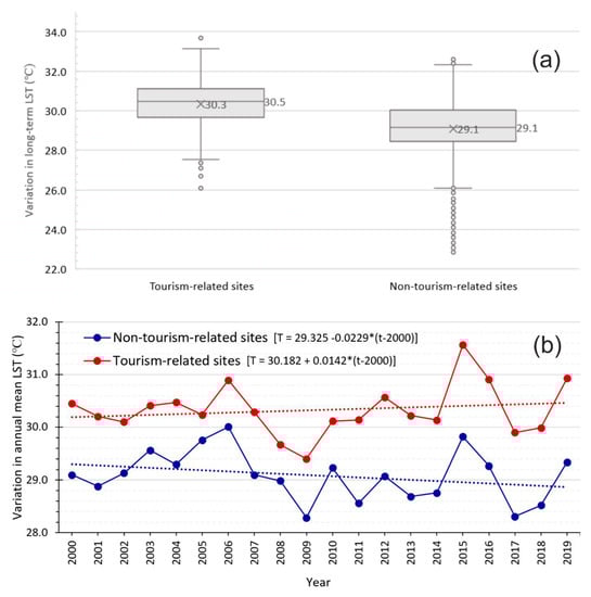 Annual LST variation in tourism-related and in non-tourism-related sites: ((a) Box and Whisker plots of long-term (20-year) variation of LST showing relatively high mean (30.3 °C) and median (30.5 °C) LST in tourism-related sites against a mean and median of 29.1 °C in non-tourism related sites. (b) Annual mean LST variation showing positive and negative trends of change in tourism-related sites and in non-tourism related sites, respectively).