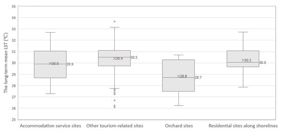 The mean LST statistics (Figure 8) for the research period was plotted for the four sub-classes. The mean LST in the past 20 years in ‘other tourism-related sites’, which encompass leisure, entertainment, transportation and dining activities, had the highest value of 30.4 °C. The mean LST in the ‘residential sites along shorelines’ (30.2 °C), which represented the residential communities along the shoreline, was higher than the mean LST in the ‘accommodation-related services sites’ (30.0 °C), which represents the accommodation facilities for tourists. The mean LST in the ‘orchard sites’ had the lowest LST (28.8 °C) of the four sub-classes of tourism-related sites.