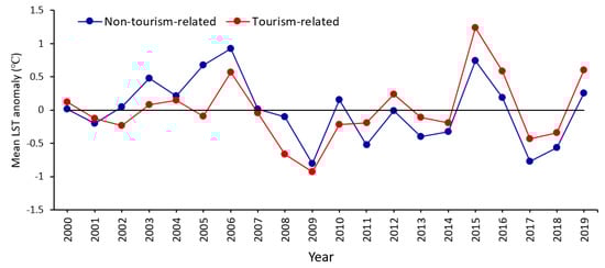 The annual LST anomaly variations for the tourism-related and non-tourism-related sites.