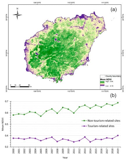 The 457 16-day NDVI images from 2000 to 2019 were used to calculate the long-term mean and annual mean NDVI images for each year in the analysed period. The annual mean NDVI values for the two classes (the tourism-related and non-tourism-related sites) in each year were plotted in a line chart to compare the NDVI discrepancy with the influence of the tourism-related activities in the same year and to show the changing trends in the annual mean NDVI over the 20 year period. The long-term mean NDVI distribution was mapped to show the spatial vegetation variation on Hainan Island in the examined 20 year period.