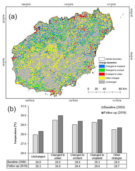 Table 3 outlines the land cover change matrix between 2000 and 2018, and the land cover in the 2 years are compared in Figure 11. From the results, we observed that cropland and dense forest decreased by 313 km2 and 328 km2, respectively, between 2000 and 2018. On the other hand, land-use classes that expanded during the same period were urban areas, water surface and orchard areas with positive changes of 313 km2, 209 km2, and 100 km2, respectively. There was a net transformation of about 16 km2 of croplands to orchards and a net transformation of about 245 km2 of cropland to urban areas. In the same period, about 65 km2 of the initial 86 km2 of shrubland was converted to urban areas, while 103 km2 of the initial 185 km2 of dense forest was also converted to urban areas. This reveals the influence of urban infrastructure on cropland, shrubland and forest cover. Orchards have mainly expanded from cropland and dense forests to meet the fruit demands of the tourism sector. The results were consistent with the land-use change research in Sanya city of Hainan [20]. Accordingly, the tourism-driven land-use dynamics mainly affected the cropland, orchards and urban areas. We mapped the tourism-driven land-use dynamics (Figure 12a) and compared the LST of 2010 and 2019 (Figure 12b). It was difficult to quantify the LST dynamics on the land dynamics every year for the long-term research, so we only used the LST in 2000 and 2019 to compare the LST changes to show the potential influence of tourism on the transformation of land-use types (Figure 12b). As can be seen in Figure 12b, the LST of the three land-use types transformed by tourism (cropland, orchard and urban land) in 2019 had increased compared with the LST of the original land-use types in 2000. Specifically, the LST difference was 0.5 °C, which was an increase from 29.5 °C to 30.0 °C that occurred when the land-use type was converted to urban land. The positive LST changes were 0.4 °C and 0.3 °C for the orchard and cropland changes.