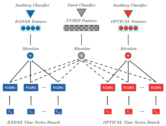 The described attention mechanism is employed over the FCGRU outputs (hidden states) in the radar and optical branches to generate per-source features ( and ). Such features encode the temporal information related to the input sources. Furthermore, the per-source hidden states are concatenated and an additional attention mechanism is employed over them to generate fused features (). Such features encode both temporal information and complementarity of radar and optical SITS. Thus, the architecture involves learning three sets of attention weights: , and , which refers, respectively, to the attention mechanisms employed over the radar, optical and concatenated hidden states.
