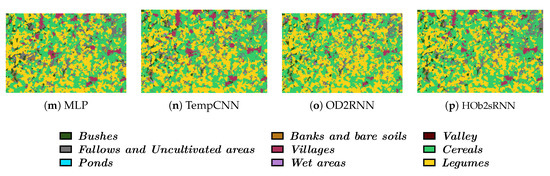 To summarize, the proposed deep learning framework exhibits convincing performances in land cover mapping considering situations characterized by a realistic amount of available training samples. The comparison with other machine learning approaches underlines three points: (i) our approach clearly outperforms the RF classifier that is a common strategy employed to deal with SITS classification; (ii) other standard machine learning methods, i.e., SVM and MLP, exhibit competitive behaviours with respect to our method on a study site that involves a small amount of labeled samples; and, (iii) our proposal surpasses, on both study sites, the adaptation of the recent TempCNN competitor for the multi-source scenario. Such result points out again that, beyond modelling the temporal correlation exhibited by SITS data via RNN or CNN approaches, in a multi-source context other features be worthy to be considered: the hierarchical class relationships as well as the way in which radar/optical information may be combined.