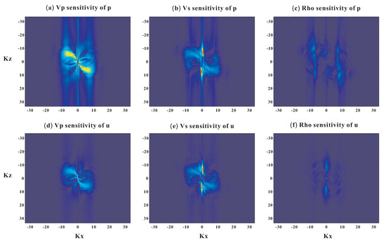 The 2D Wavenumber spectrum for the sensitivity kernels of pressure (top) and displacement (bottom) components with respect to (a,d) , (b,e) , and (c,f) .