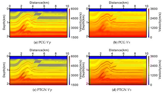 We first use the Overthrust model to demonstrate the effectiveness of the proposed PTGN algorithm for OBC 4C data. The true and models are shown in Figure 4. The density model is set to be 1000 kg/m3 in the water layer and 2000 kg/m3 below the seabed. The model is sampled as 801 × 166 grids with intervals of 12.5 m in both horizontal and vertical directions. The initial parameters are generated from the true ones with a smoothing window of 250 m. The acquisition geometry includes 101 shots with an interval of 100 m below the sea surface and 801 OBS receivers at the seabed for each shot. The total recording time is 4.0 s, and the temporal sampling rate is 1.0 ms. Observed seismic data are shown in Figure 5, including horizontal and vertical displacements and pressure components. As a comparison, the inversion is also performed using a preconditioned conjugate gradient (PCG). The maximum number of the loop for parameter update is 21, and that of the inner loop in the PTGN algorithm is 10.