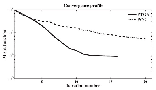 Convergence profiles of the misfit function using PTGN (solid) and PCG (dashed).