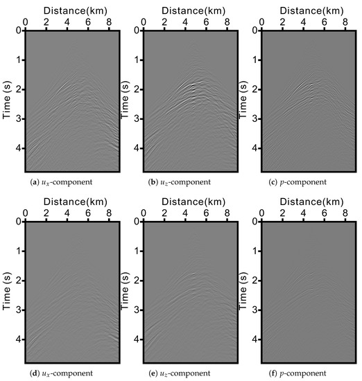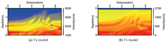 In regional and global seismic explorations, sensitivity kernels are always used to portray subsurface wavepaths [33,34]. For the elastic case, the kernels of displacement components with different parameter classes have been studied on the standard elastic equation [23,35]. In this study, we use the modified AEC equation to simulate elastic wavefields, allowing for the kernels of pressure and displacement components. The experiment is performed on the elastic Marmousi model (see Figure 1), including a shallow water layer below the sea surface. Only one shot is excited to generate a pure P-wave source at the place of (5 km, 0.03 km), and 601 4C receivers are evenly located at the seabed. The peak frequency of the source function is 8 Hz.