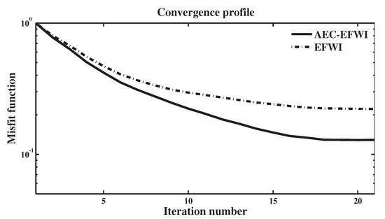 Convergence profiles of the AEC-EFWI (solid) and EFWI (dashed) methods.