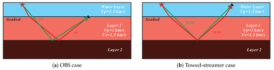 Cartoons of the wave propagation for 1C (a) ocean bottom seismic (OBS) and (b) towed-streamer cases.