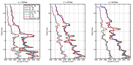 Figure 13 displays the inverted and models using the two methods. In the results (Figure 13a,c), AEC-EFWI provides better-resolved structures, i.e., anticlines, faults, lithologic interfaces, and high-speed bodies. For (Figure 13b,d), however, the results using the two methods are comparable. With incorporation of the RMS errors in Table 2, we can find that considering the pressure data may not take as great effects on as . It may be because the pressure data are more sensitive to the perturbations.