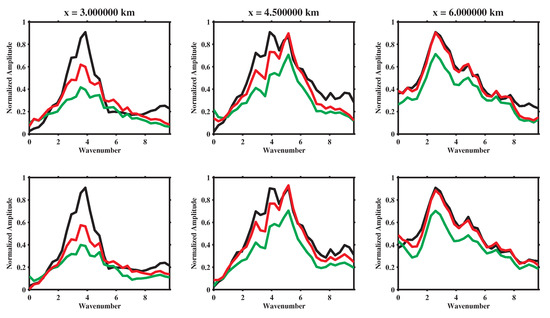 The 1D wavenumber spectrum of vertical profiles, corresponding to Figure 14. Black lines denote the true model, red lines indicate the AEC-EFWI results, and green lines are the EFWI results.
