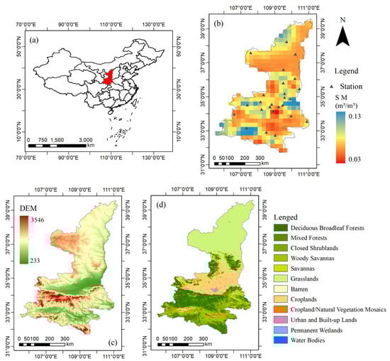 The background of study area. (a) The study area is in the interior of China. (b) The soil moisture is from the advanced microwave scanning radiometer 2 (AMSR2) in July 2016. The ground data stations are also shown in the map. (c) Elevation from the shuttle radar topography mission (SRTM) digital elevation model (DEM). (d) Land cover in 2010.