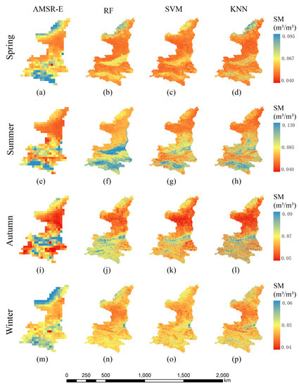 Comparison of the three-machine learning methods SM downscaled results with the AMSR-E SM products in the four seasons of 2010. (a–d) Spring; (e–h) summer; (i–l) autumn; (m–p) winter.