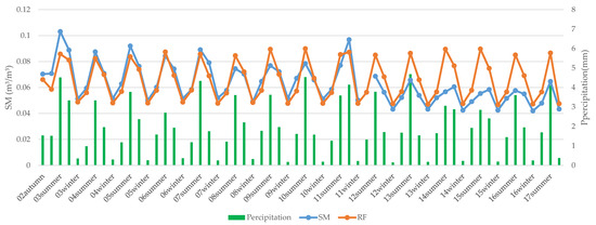 According to the performance of different auxiliary factors in each season, precipitation is the key factor affecting soil moisture. In previous studies, although the time-continuous variation trend of precipitation and soil water value was compared, precipitation was rarely directly used as an influencing factor to participate in modeling. One reason is that the spatial resolution of precipitation products is relatively coarse. Another is that there may be a time hysteresis effect between soil moisture and precipitation. The occurrence of rainfall is on a large scale. It can be implied that the impact of coarse resolution precipitation products is relatively small. In general, the soil depth in remote sensing data is generally around 5 cm, because the microwave penetrates the soil up to 5 cm. There is no time lag between soil moisture and precipitation at this depth at seasonal scale. According to Figure 5, the change trend of soil moisture is roughly the same as that of precipitation. Some extreme soil moisture values are accompanied by extreme rainfall values.