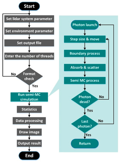 The flow chart of the simulator is shown in Figure 3. To run the semianalytic MC simulation process with the simulator, lidar parameters (laser pulse energy, pulse width, height of the lidar, divergence angle of laser, etc.), environment parameters (absorption and scattering coefficients and phase functions of atmosphere and seawater, etc.) and output file parameters (vertical resolution of atmosphere and seawater, path of output file, etc.) need to be set.