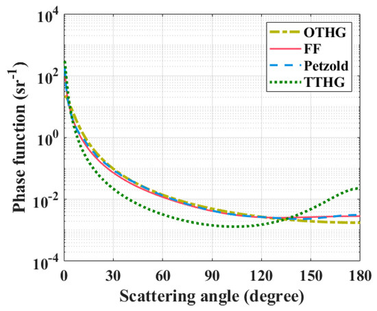The particle backscattering fraction Bp represents the probability that a photon will be scattered through an angle , which is given by . The subscript p represents particles, and bb is the backscatter coefficient, which is the integral of the VSF over the hemisphere of the backscattering directions. These mentioned phase functions are plotted in Figure 5 with Bp = 0.0183, which is consistent with that of the Petzold phase function [46]. These seawater phase functions are all strongly peaked in the forward direction. In the backward scattering direction, both FF and OTHG are similar to Petzold. However, the TTHG phase function has a characteristic of high backscattering and low forward scattering compared to the other three phase functions according to Figure 5.