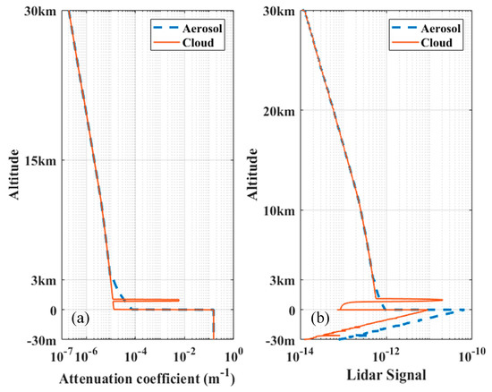 In order to give an overall view of the performance of this simulator, firstly, we simulate the spaceborne lidar return signal from the atmosphere and ocean. The atmosphere within 30 km (atmosphere above 30 km is clean air) is equally divided into 300 horizontal layers. The Rayleigh-scattering theory is adopted to calculate the optical properties of air molecules [50]. Two typical atmosphere cases are shown in Figure 6, where the blue dashed line is for aerosol and the red solid line is for cloud.