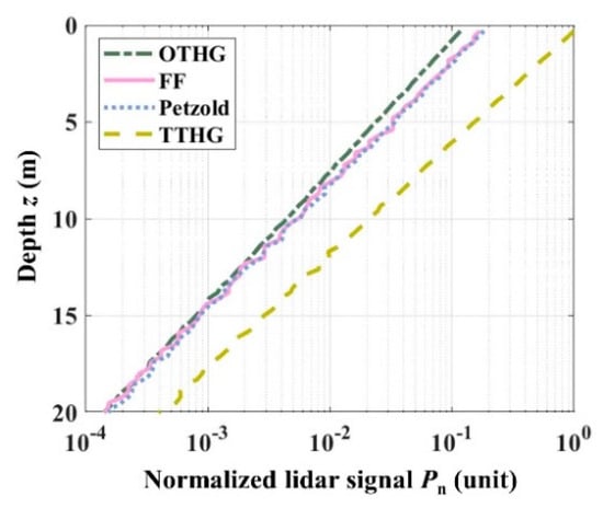 Lidar signals for OTHG, FF, and Petzold phase functions tend to be equal, and the difference between the signal for the TTHG phase function and the other three tends to be small with the increasing depth. The reason for this tendency lies in the multiple scattering effect. The emitted laser beam maintains good collimation in the shallow water, and the backscattering angle is nearly 180°. As the depth increases, the laser beam gradually diverges due to the multiple scattering, resulting in a backscattering angle less than 180° [52]. With the increases of depth, multiple scattering shows stronger impacts on the lidar signal. The backward TTHG phase function decreases with the decrease of the angle, while the other three backward phase functions increase with the decrease of the angle, so that the gap of the signal decreases. More detailed information about the influence of the phase function on the lidar signal is shown in [52].