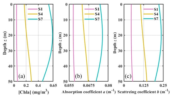 where is the scattering coefficient of pure seawater, and its value is 0.022 m−1 at a wavelength of 532 nm. The vertical distributions of the inherent optical properties (IOPs) and chlorophyll a concentration for these three waters are shown in Figure 9.
