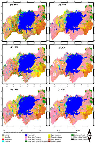 Land cover maps of the LVB for (a) 1985, (b) 1990, (c) 1995, (d) 2000, (e) 2010, and (f) 2014.