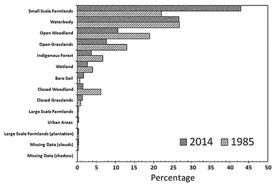We derived the hectarage for each land cover class for each epoch (1985, 1990, 1995, 2000, 2010, and 2014) and subsequently computed the percent increase or decrease in area per land cover class for each epoch year, using 1985 as the base year. We also regressed the area under indigenous forests, open woodlands, wetlands, closed woodlands, largescale farmlands (plantation), largescale farmlands, and closed grasslands against either urban areas or small scale farmlands. Regression analysis enabled us to measure the statistical relationships between land cover patterns elucidated in our work. We hypothesized that human activity (e.g., urban growth, expansion of small scale agriculture, deforestation) in the LVB could be correlated with a decline in natural vegetation, which is a phenomenon witnessed globally [23].
