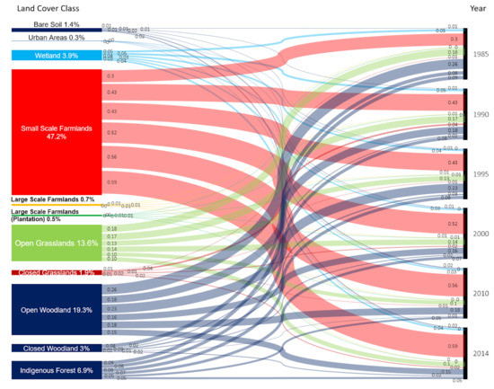 Our area computations were consistent with published area estimates for the Lake Victoria water mass and the LVB land mass, approximately 6 million and 18 million hectares, respectively (Table 2). From 1985, land cover land use change in the LVB is noticeable, with increases in the hectarage under small scale farmlands, urban areas, and bare soil (Table 2). Between 1985 and 2014, the urban areas grew by over 800%, the bare soil by over 140%, the small scale farmlands by over 90%, and the large scale farmlands by 55%. Furthermore, the open grasslands, open woodlands, closed woodlands, and indigenous forests declined by 41%, 43%, 75%, and 44%, respectively (Table 2). The mean area per class (shown as percentage) and the proportions associated with each year are shown in the Sankey diagram in Figure 6. We also noticed highly significant correlations between the decline in indigenous forests, open and closed woodlands, wetlands, and open grasslands and the growth in small scale farmlands. In addition, we observed significant correlations between indigenous forests, wetlands, and open grasslands and the growth in urban areas (Table 3). However, correlations between areas under open and closed woodlands and urban areas were not significant. Moreover, there is no significant correlation between the areas under large scale farmlands and closed grasslands and small scale farmlands (Table 3). The land cover maps presented in this work are hosted at the RCMRD Geoportal (http://geoportal.rcmrd.org/layers/?limit=100&offset=0&title__icontains=Lake%20Victoria%20Basin%20Land%20Cover) and are publicly available, which facilitates data sharing as well as other studies focusing on similar objectives.
