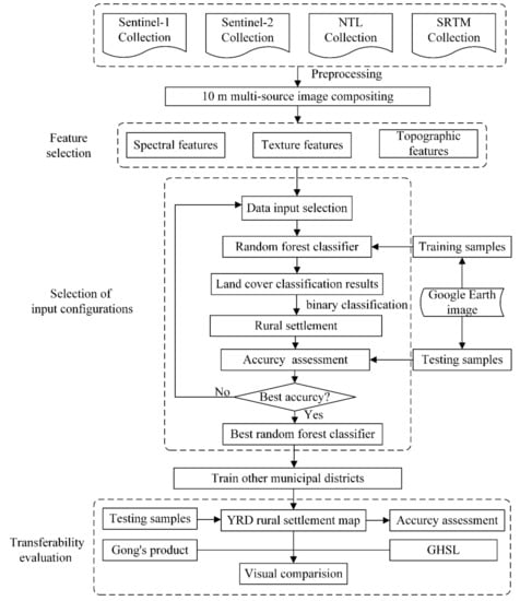 Although the GEE platform provides pre-processed Landsat, Moderate Resolution Imaging Spectroradiometer (MODIS), and Sentinel series, and other commonly used remote sensing data products, in addition to thousands of environmental, geophysical, and socioeconomic datasets, an efficient method that can fully integrate these multi-source data to produce an accurate rural settlement map at a high spatial resolution for a large area is still lacking. Herein, we propose a framework for rural settlement mapping from multi-source data in the Yangtze River Delta, China, using GEE. The present study makes three main contributions: (1) The proposed framework was able to produce a 10 m rural settlement map from multi-source remote sensing datasets including Sentinel-1 Synthetic Aperture Radar (SAR), Sentinel-2 MultiSpectral Instrument (MSI), Visible Infrared Imaging Radiometer Suite supporting a Day-Night Band (VIIRS-DNB), and Shuttle Radar Topography Mission-Digital Elevation Model (SRTM-DEM) imagery using the GEE platform; (2) we investigated the importance of various features by gradually introducing different data based on the random forest classifier, showing that the best input configurations were determined when all features were input; (3) we made full use of the transferability of the trained models to obtain the distribution of rural settlements and tested the effectiveness of transferability, which could save substantial time and labor to create a large number of training samples.