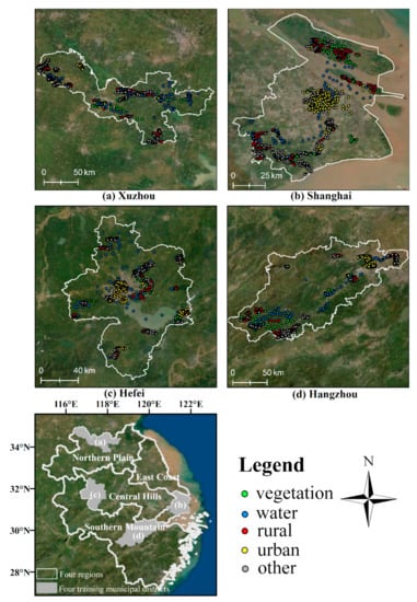 To better extract rural settlements in the entire Yangtze River Delta region, we divided the study area into four regions based on the characteristics of the rural settlements: Northern Plain, East Coast, Central Hills, and Southern Mountain. The Northern Plain has a mainly plain terrain in the northern part of the Yangtze River Delta, a warm temperate semi-humid monsoon climate, and contains 9 municipal districts. The East Coast in the eastern part of the Yangtze River Delta, whose terrain mainly includes alluvial plains and delta plains, comprises 6 coastal municipal districts. The Central Hills, located in the middle of the Yangtze River Delta, contains 12 municipal districts. Its terrain is mainly composed of hills. The Southern Mountain has a large number of hillsides in the southern part of the Yangtze River Delta and covers 14 municipal districts. The climate in East Coast, Central Hills, and Southern Mountain regions is a subtropical monsoon climate. To validate the transferability of our model, we selected reference samples only in one municipal district from each region: Xuzhou in the Northern Plain, Shanghai in the East Coast, Hefei in the Central Hills, and Hangzhou in the Southern Mountain. We obtained all reference samples in the four selected municipal districts by visual interpretation from the high-resolution Google Earth Imagery. The reference samples were randomly distributed in each municipal district. We especially avoided the issue of spatial autocorrelation of reference samples mentioned in [], so each sample was extracted within a 10 × 10 m area from every region of interest (ROI), which also ensured the homogeneity and geographic integrity of the samples. There should be abundant training data in all classes [], so we selected 200 reference samples for each class in each municipal district. The division of the study area and distribution of each land cover class among training municipal districts are illustrated in Figure 3.
