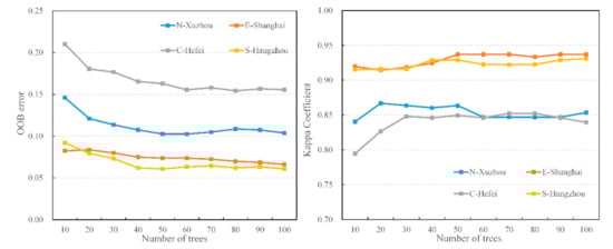 Impacts of different numbers of trees on the out of bag (OOB) error and the Kappa coefficient in the four trained random forest classifiers in four training municipal districts. N-Xuzhou, E-Shanghai, C-Hefei, and S-Hangzhou represent Xuzhou in Northern Plain, Shanghai in East Coast, Hefei in Central Hills, and Hangzhou in Southern Mountain, respectively.