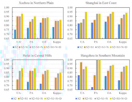 User’s accuracy (UA), producer’s accuracy (PA), overall accuracy (OA), and Kappa coefficient of four input configurations in four training municipal districts. With more features added, higher accuracy was achieved.