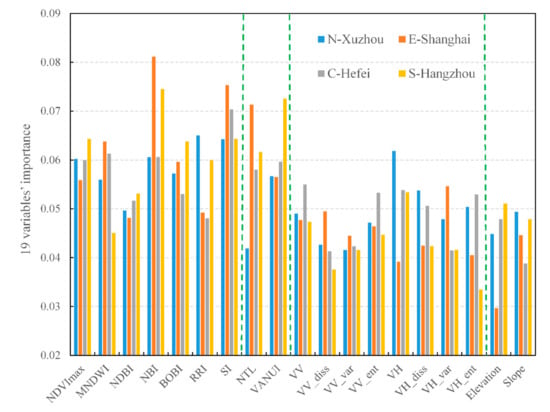 Moreover, this work shows that different features provide different types of information and highlight different issues by presenting the feature importance in Figure 5. The importance of features trained varies significantly in different regions. For instance, the importance of MNDWI in Hefei in the Central Hills, where many small rivers and lakes are distributed, is much greater than that in other cities; the importance of elevation and slope in Hangzhou in the Southern Mountain, where a large number of mountain areas are located, is significantly higher than that in other regions; NTL plays an important role in extracting rural settlements in Shanghai, an international metropolis in the East Coast where the nightlight value is significantly higher than those in other regions. In short, different datasets have different capabilities in recognizing land cover classes, facilitating the improvement of the overall classification accuracy []. Specifically, NDVImax can solve the problem of mixing bare land and rural settlements caused by the difference in the cultivation time of land crops. MNDWI is the most commonly used water index to separate the water and non-water classes. NDBI and NBI are two built-up indices helpful for mapping built-up areas. The present study found that SI, RRI, and BOBI, all of which have higher importance scores, are able to distinguish settlements from bare land effectively (Figure 5). The DN values in cities are significantly higher than in rural areas. Therefore, NTL from VIIRS-DNB is used to signify the urban areas. VANUI is employed to increase the difference between urban and rural DN values to better distinguish them. Since the distribution of rural settlements is related to the terrain, the elevation and slope from SRTM-DEM data are also beneficial to the classification. These features are therefore indispensable in the accurate mapping of rural settlements with different distribution patterns.
