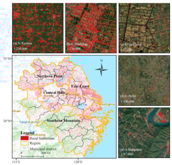 Spatial distribution of rural settlements in the Yangtze River Delta. N-Xuzhou, E-Shanghai, E-Yancheng, C-Hefei, and S-Hangzhou represent Xuzhou in Northern Plains, Shanghai in East Coast, Yancheng in East Coast, Hefei in Central Hills, and Hangzhou in Southern Mountain, respectively. The five subplots demonstrate the representative rural settlements of the municipal district.