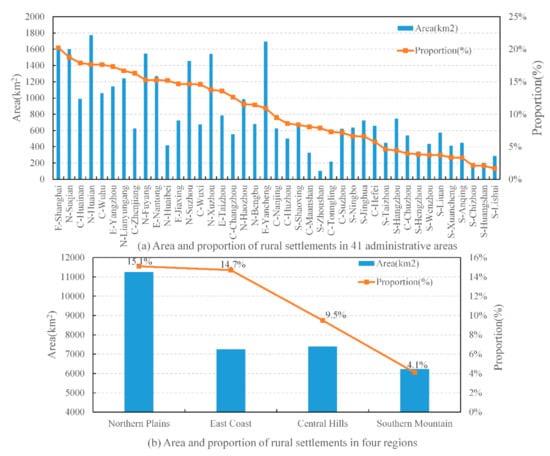 Area and proportion of rural settlement at different levels. (a) Municipal district level, (b) Region level.