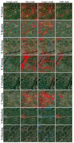 The result of rural settlement extraction was not very satisfactory in the Global Human Settlement Built-Up Grid (GHS_built). The extracted objects are mainly human settlements: it maintained a high performance in urban settlements, while it might underestimate some rural settlements. In addition, its research scope and designed algorithms are global-oriented, which may not be perfect in all regions, especially in regions with complex rural settlement distribution types, such as the Yangtze River Delta. Specifically, in the Northern Plain, the mixed phenomena of our results were slightly fewer than those reported by Gong et al. []. As illustrated in N-Bengbu, many cultivated land and roads were mistakenly extracted as rural settlements in their study. Although the extraction results in the present study were slightly better, there were still a few mixed phenomena. In the East Coast region, our results were slightly better than those obtained by Gong et al. []. Some rural settlements were missed in their study, mainly due to their use of the Landsat imagery at 30 m resolution. Because most of the rural settlements in this region are distributed in strips along roads and rivers, it is difficult to distinguish them in Landsat data. The images used in the present study were 10 m resolution. In addition, we combined a variety of features, which may help identify some small rural settlements. Therefore, our extraction results were greatly improved. In the Central Hills and Southern Mountain, compared to the results obtained by Gong et al. [], our results were better. In the Central Hills, the omission phenomenon (Figure 7 C-Chuzhou) and mixed errors (Figure 7 C-Nanjing) existed, mainly due to the complex land cover types. Rural settlements in this region are relatively small, some of which even only contain several households, making it difficult to distinguish them from other features. In the Southern Mountain, Gong et al. [] did not obtain very satisfactory results, which may be related to the use of the mask method []. This is likely to lead to the omission of low-density rural settlements. By contrast, our results showed a reliable effect, mainly attributed to the strong sensitivity of backscattering characteristics to man-made structures of SAR data and the nighttime data of VIIRS-DNB []. In summary, the transferability of the four trained models was satisfactory.