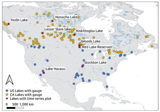 For validation of the selected lakes We apply in situ level data from the US and Canada, which is freely available from https://maps.waterdata.usgs.gov/mapper/index.html and https://wateroffice.ec.gc.ca, respectively. Figure 1 displays the location of the applied in situ data.