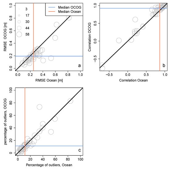 In the subplots of Figure 2 and Figure 3 the Ocean and OCOG based results are plotted against each other and the size of the circles indicates the number of cycles (out of a maximum of 58) used to calculate the validation measures. To highlight the details of the RMSE values (Figure 2a and Figure 3a,b), the range is limited to 1 m, but for both areas a handful of sites have an RMSE value larger than 1 m. The orange and blue lines indicate the median RMSE value for the Ocean and OCOG based results, respectively. The medians of the validation measure distributions and their 95% confidence interval are provided in Table 1. The RMSE values for the US sites are generally below 0.5 m, the Pearson correlation is generally above 0.75, and the percentage of outliers is generally below 20% (Figure 2).