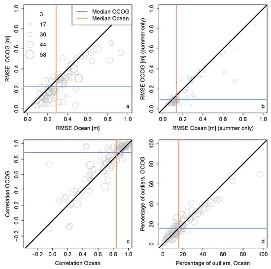 Scatter plot of (a) RMSE values, (c) Pearson correlation, and (d) percentage of outliers for the Canadian lakes. The vertical orange and blue lines represent the median RMSE values for the Ocean and OCOG retrackers, respectively. The size of the circles indicates the number of cycles used in the calculation of the summary measures. To allow a greater detail, only RMSE values below 1 m are shown. Subplot (b) shows the RMSE values based on summer data only.