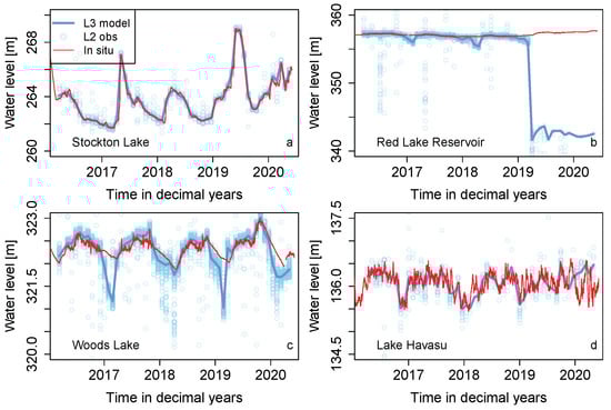 Lake level time series for selected US lakes (a) Stockton Lake, (b) Red Lake Reservoir, (c) Woods Lake, and (d) Lake Havasu.
