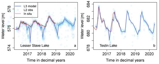 Typical lake level time series for Canadian lakes (a) Lesser Slave Lake and (b) Teslin Lake.
