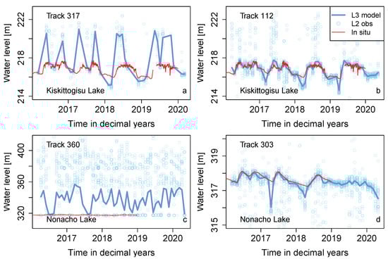 Examples of two lakes, where the time series model fails to reconstruct the observed water level due to noisy data. Subplots (a,b) show lake level time series for lake Kiskittogisu based on track number 317 and 112, respectively. Subplots (c,d) show lake level time series for lake Nonacho based on track number 360 and 303, respectively.