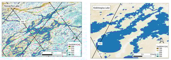 Maps displaying the local topography in the vicinity of Lake Nonacho (left) and Lake Kiskittogisu (right). The Elevations are WGS84 ellipsoid heights from the TanDEM-X elevation model.