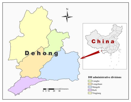 The Dehong Prefecture is located at the southwestern border of China and to the west of Yunnan Province between 97°31′–98°43′ E and 23°50′–25°20′ N, with a total area of 11,172 square kilometers. The terrain of the DH Prefecture is high in the northeast and low in the southwest, generally between 800 and 2100 m above sea level. As of 2019, the prefecture had jurisdiction over 2 county-level cities (Mangshi city and Ruili city), 3 counties (Longchuan County, Yingjiang County, and Lianghe County) and 50 towns. There are more than 30 ethnic minorities living in the prefecture, such as Dai, Jingpo, Achang and Deang minorities. The 2010 census data show that the total population of the prefecture was 121,000. Among the populations of five counties and cities in the prefecture, the population in cities accounts for 34.18% of the total population, and the population in villages accounts for 65.82% of the total population. According to the “DH Prefecture Yearbook” (http://data.cnki.net/), the prefecture-level GDP increased from 147 million RMB to 35,697 million RMB from 1978 to 2017, with an average annual growth rate of 10.0%. Moreover, the construction of a series of infrastructure projects, such as airports, expressways, railways and hydropower stations propelled the economic and social development as well as the quality of life in the prefecture. The administrative divisions and geographical position of the DH Prefecture are shown in Figure 1.